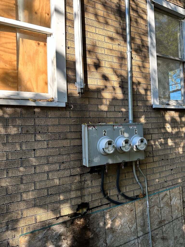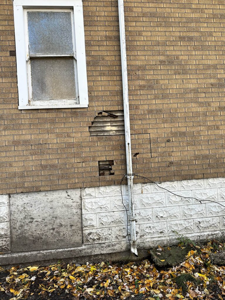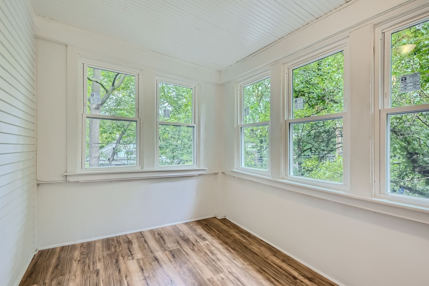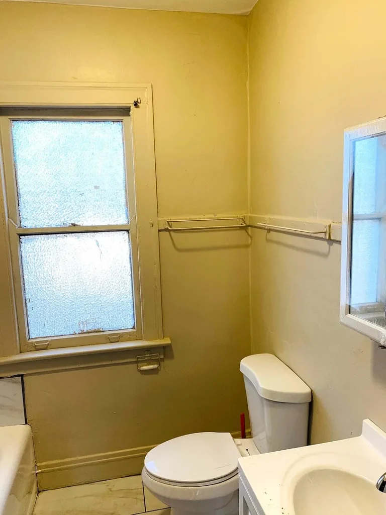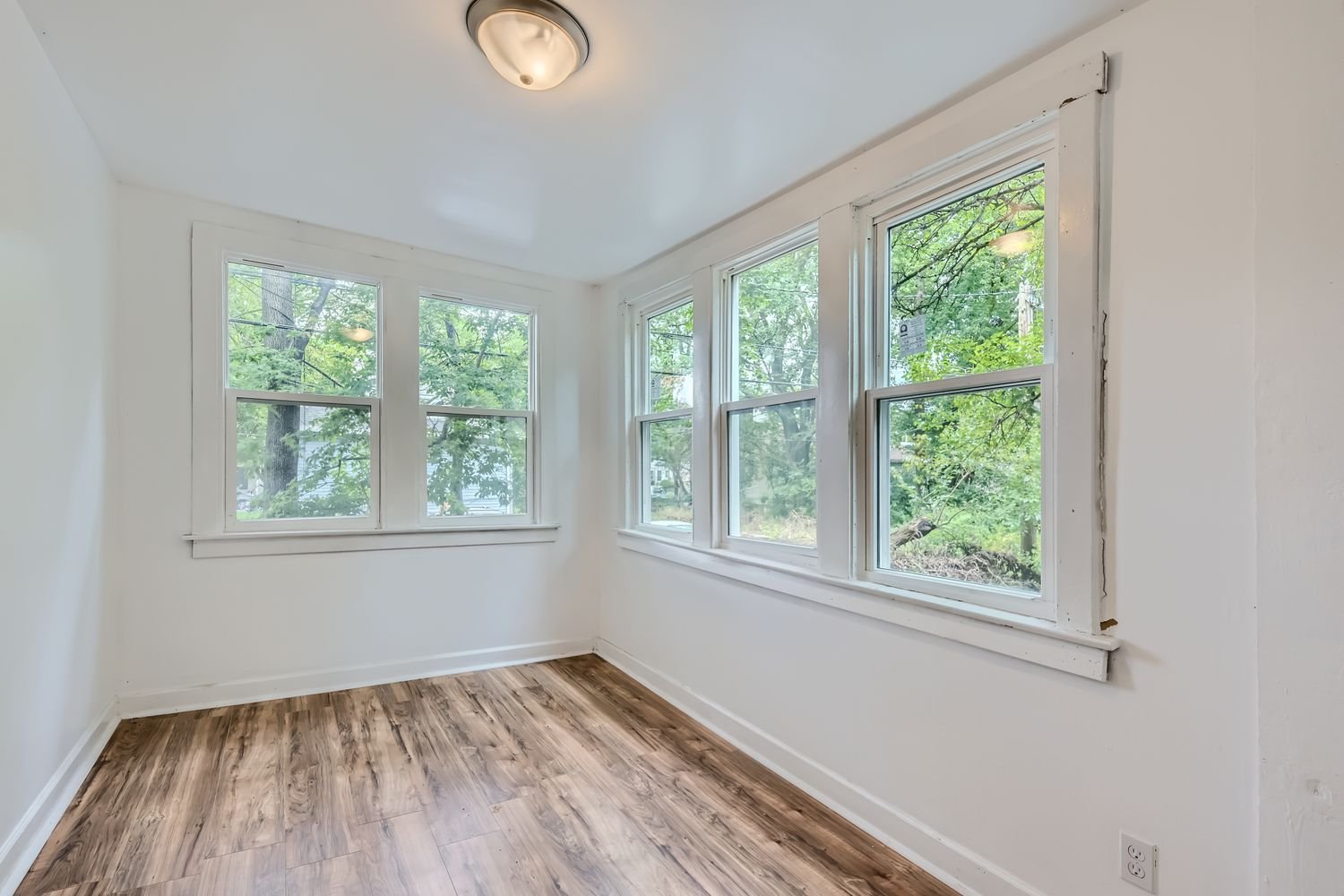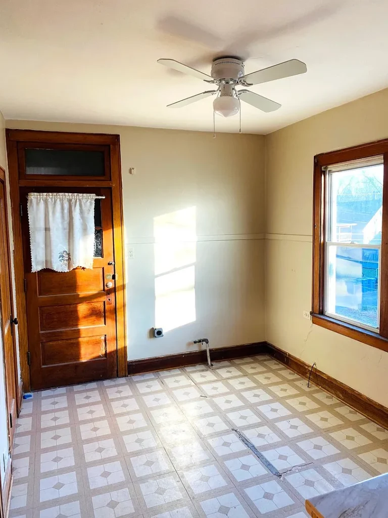 Gut unit, plaster walls, new bathroom plumbing, new windows, new siding and gutters, floring, and trim installation.
