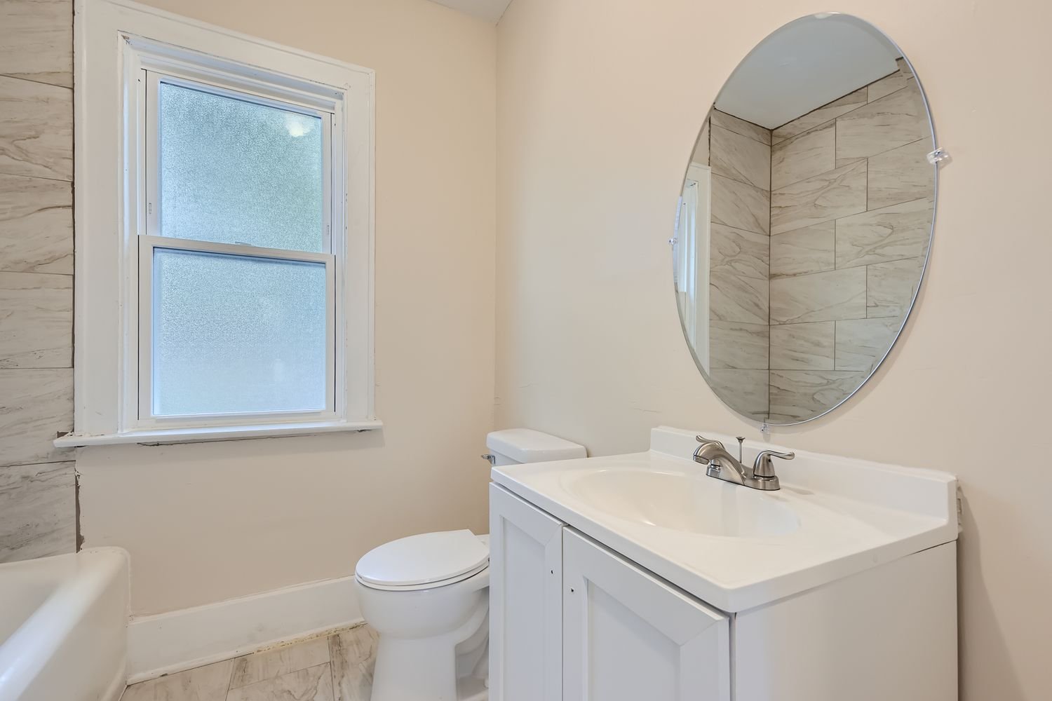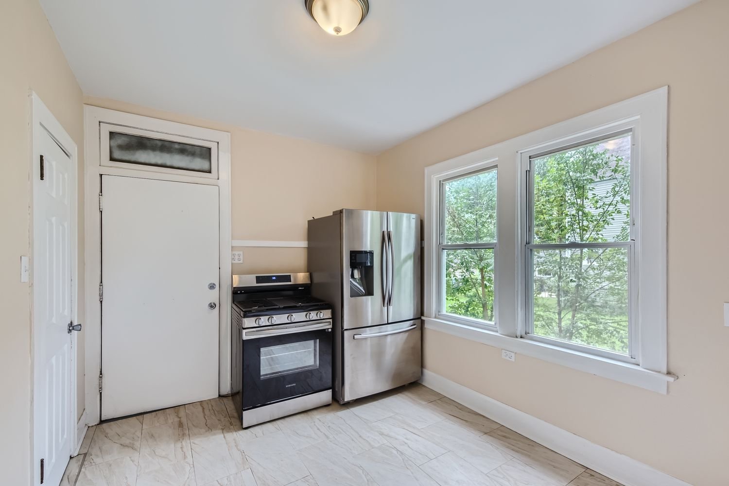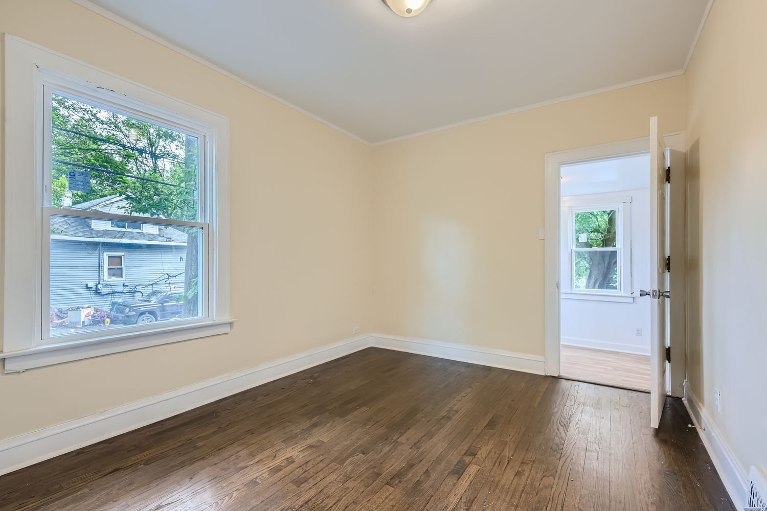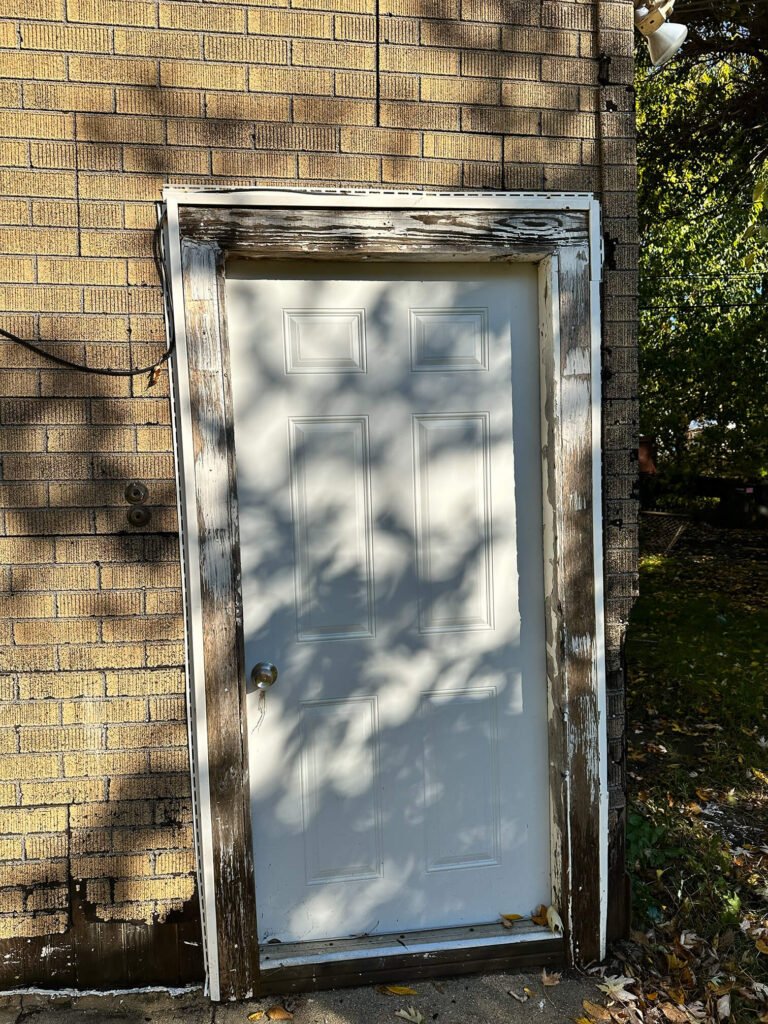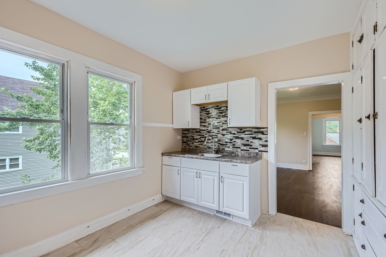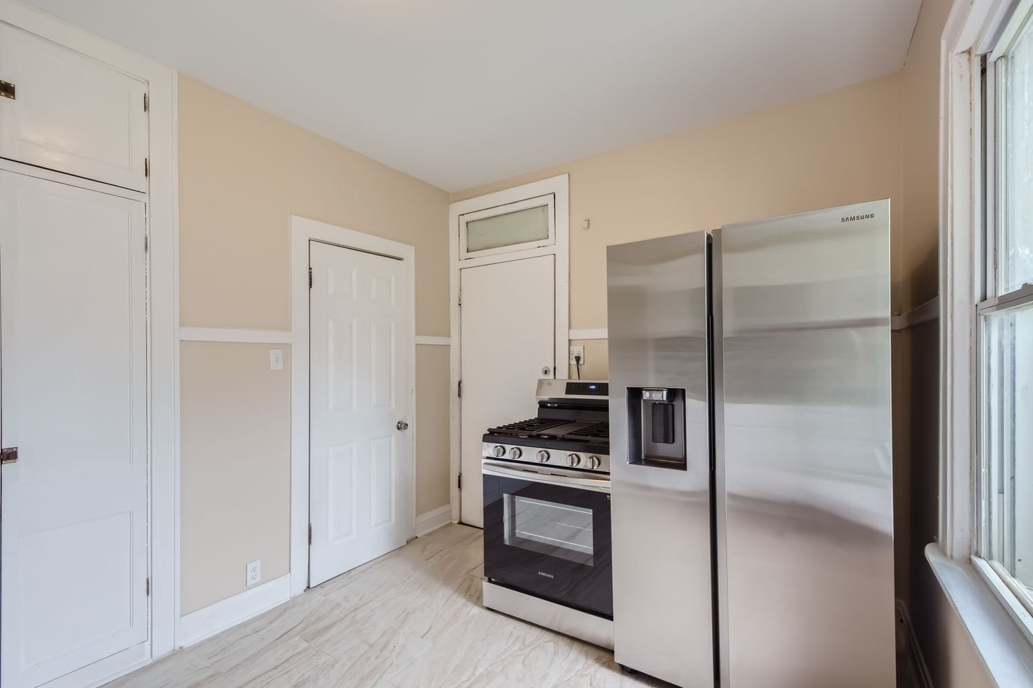 Gut unit, plaster walls, new bathroom plumbing, new windows, new siding and gutters, floring, and trim installation.